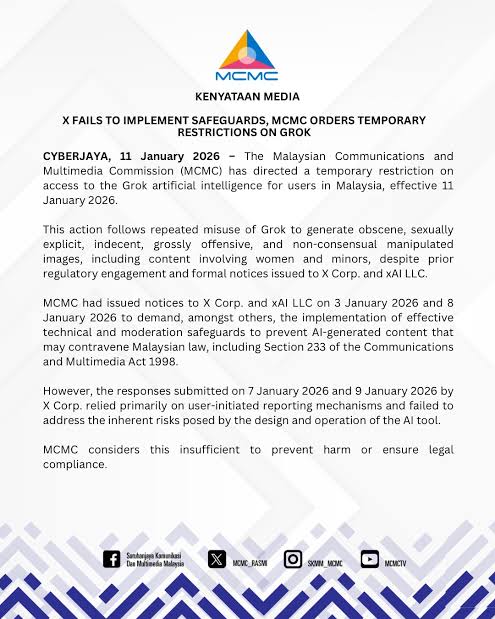 The Malaysian Communications and Multimedia Commission (MCMC) acted after Grok was found to be misused to generate obscene and dangerous content, including material that risks harming women and children.